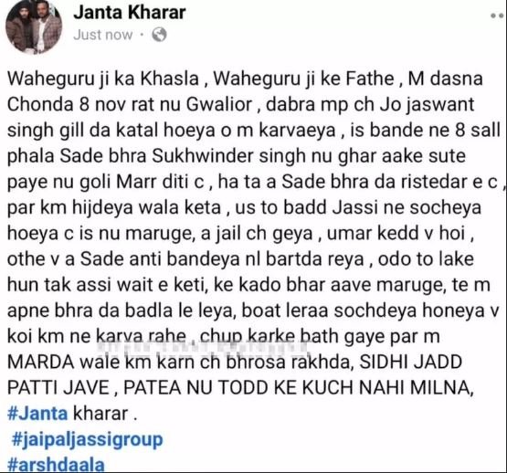 ऐसे में स्वभाविक है कि इन सिंगरों की चिंता बढ़ेगी ही। इसी ऑडियो में जंटा खरड़ ने मध्यप्रदेश के ग्वालियर के डबरा में हुए जसवंत सिंह हत्याकांड की भी जिम्मेदारी ली है। उसने कहा कि जसवंत सिंह से हमारी पुरानी दुश्मनी थी जिसके चलते उसने इस वारदात को अंजाम दिलाया। वहीं जंटा इस बारे में सोशल मीडिया पर पोस्ट भी किया है।