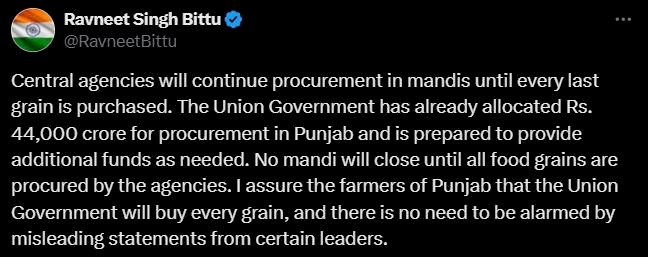 केंद्रीय मंत्री रवनीत बिट्टू ने अपनी सोशल मीडिया पोस्ट में लिखा कि केंद्रीय एजेंसियां मंडियों में तब तक खरीद जारी रखेंगी, जब तक कि धान का एक-एक दाना नहीं खरीदा जाता है।उन्होंने लिखा कि केंद्र सरकार ने पंजाब में खरीद के लिए पहले ही 44 हजार करोड़ आवंटित कर दिए हैं और जरूरत पड़ने पर अतिरिक्त धनराशि देने को तैयार है।