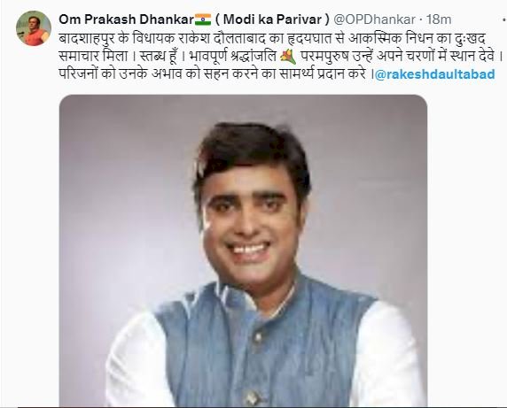 उन्होंने अपनी एक्स पोस्ट में लिखा-बादशाहपुर से विधायक और सदन में मेरे साथी श्री राकेश दौलताबाद जी के आकस्मिक निधन से स्तब्ध हूं। ईश्वर उनकी आत्मा को अपने श्री चरणों में स्थान दें और परिवार को यह दुख सहन करने की शक्ति दें।
