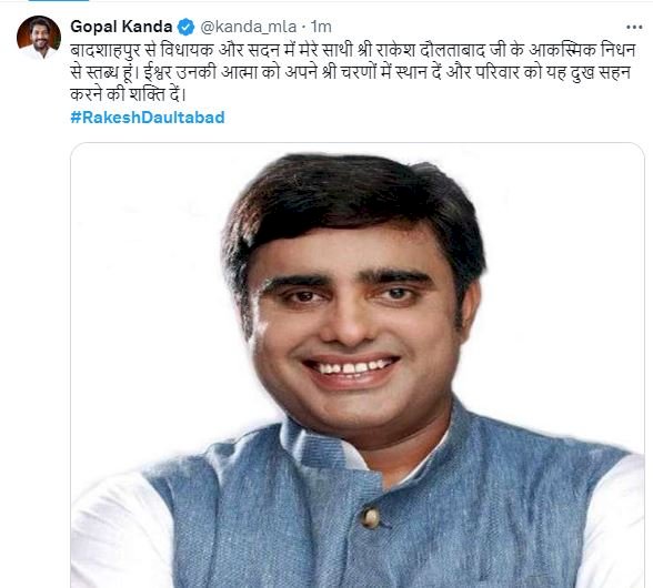 बादशाहपुर के विधायक राकेश दौलताबाद का हृदयघात से आकस्मिक निधन का दुःखद समाचार मिला । स्तब्ध हूँ । भावपूर्ण श्रद्धांजलि। परमपुरुष उन्हें अपने चरणों में स्थान देवे । परिजनों को उनके अभाव को सहन करने का सामर्थ्य प्रदान करे । विधायक गोपाल कांडा ने भी एक्स पर पोस्ट लिखी और राकेश दौलताबाद के निधन पर शोक प्रकट किया। और भगवान से परिवार को ये दुख सहन की शक्ति देने की प्रार्थना की।