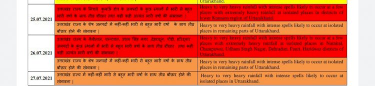 देहरादून। मौसम विभाग ने उत्तराखंड में 25 जुलाई से 27 जुलाई तक यानी तीन दिन भारी से भारी बारिश का अलर्ट जारी किया है। मौसम विभाग ने 25 एवं 26 जुलाई को भारी बारिश का रेड अलर्ट तथा 27 जुलाई को ऑरेंज अलर्ट जारी करते हुए सतर्क रहने की सलाह दी है। मौसम विज्ञान के मुताबिक उत्तराखंड में 25 ,26 एवं 27 जुलाई को मूसलाधार बारिश होने की संभावना है। 25 जुलाई को नैनीताल ,चंपावत , पौड़ी , उधम सिंह नगर ,हरिद्वार , पिथौरागढ़ में भारी से भारी बारिश की संभावना है। 26 जुलाई को राज्य के नैनीताल उधम सिंह नगर देहरादून ,पौड़ी ,चंपावत , पिथौरागढ़ , नैनीताल हरिद्वार समेत राज्य के अधिकांश जनपदों में कहीं-कहीं भारी से बहुत भारी बारिश की संभावना है। जिसको लेकर मौसम विभाग ने रेड अलर्ट जारी किया है। 27 जुलाई को भारी बारिश का ऑरेंज अलर्ट जारी करते हुए बताया कि राज्य के पर्वतीय तथा मैदानी जनपदों के कुछ स्थानों पर तेज बारिश की संभावना है।